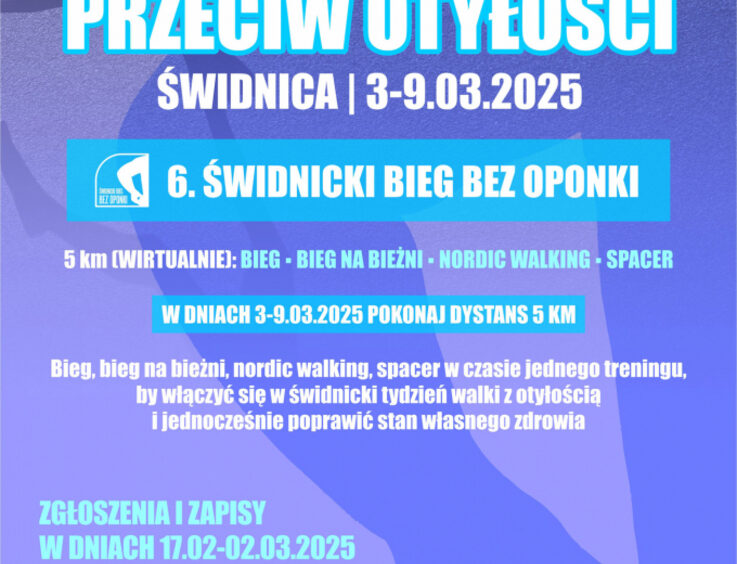 Zapraszamy do udziału w szóstej edycji wirtualnego biegu „Świdnicki Bieg Bez Oponki”. W ciągu tygodnia, od 3 do 9 marca, Twoim zadaniem jest pokonanie co najmniej 5 km podczas jednego treningu. Możesz wybrać dowolną formę aktywności, taką jak bieg, bieg na bieżni, nordic walking lub spacer. To doskonała okazja, aby rozpocząć swoją przygodę z aktywnością fizyczną i zdrowym stylem życia, a także pozbyć się zbędnych kilogramów.